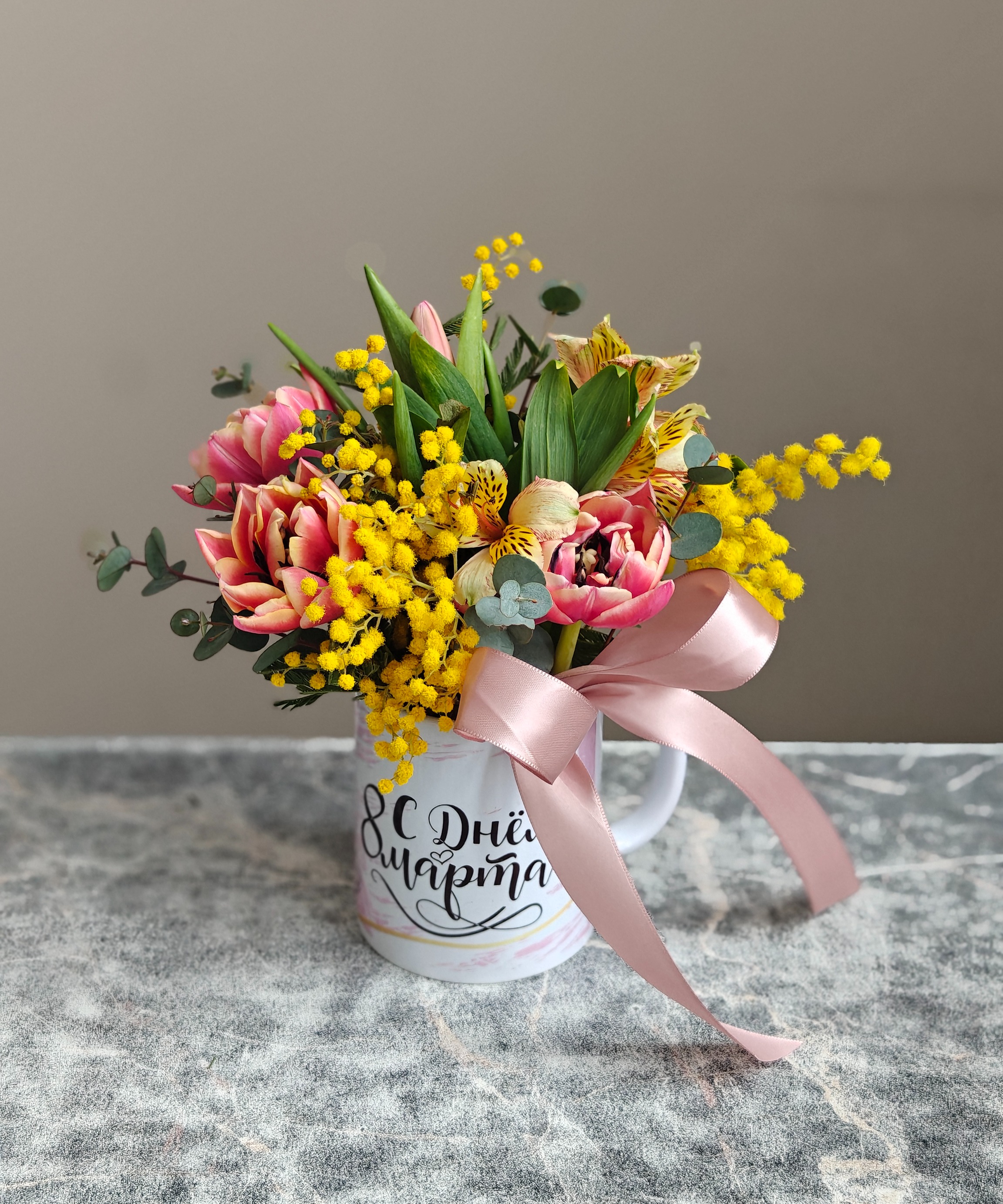 Подарите близким ароматное настроение весны! Композиция с тюльпанами и мимозой в стильной керамической кружке – идеальный подарок к 8 Марта. Яркие бутоны символизируют тепло, нежность и заботу о близких. Удобная форма кружки позволяет использовать её после использования композиции как сувенир или горшок для комнатных растений. Приятно дарить красоту и радость!