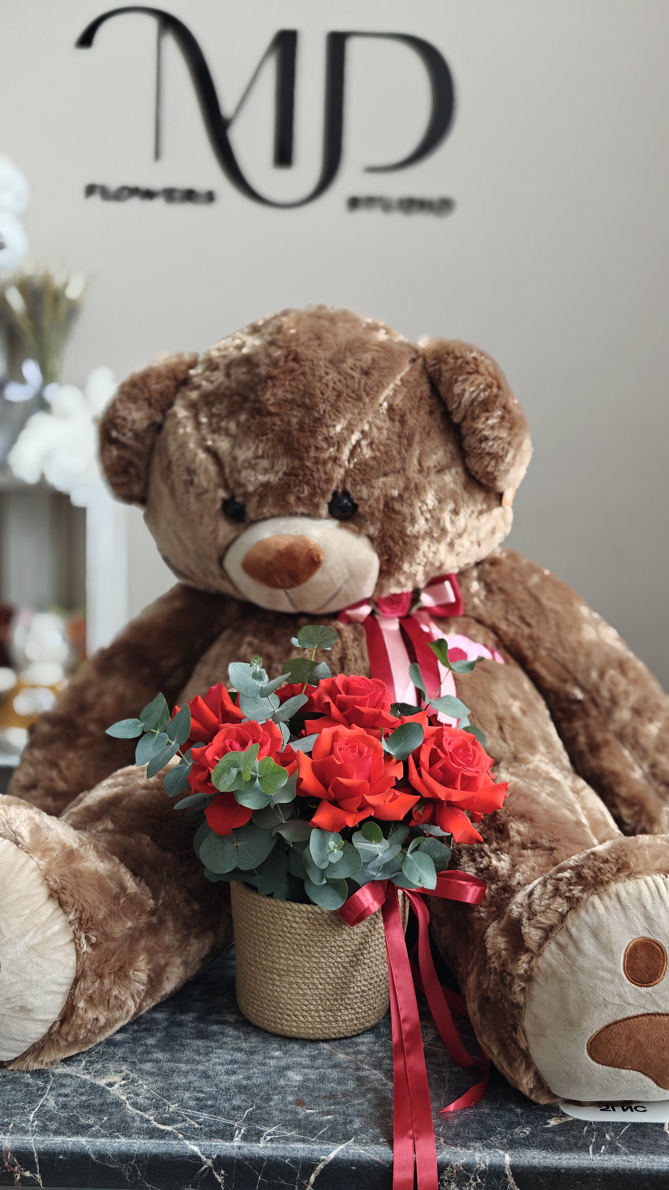 Медведь плюшевый+ композиция в джуте с французскими розами Нина